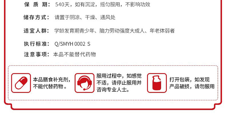 • 注意事項(xiàng) 本產(chǎn)品為膳食補(bǔ)充劑,不能代替藥物,不宜超過推薦量或與同類營養(yǎng)補(bǔ)充劑同時(shí)食用